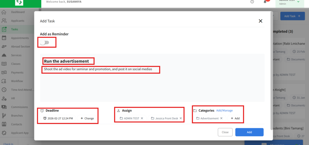 - If the task is for you, you can toggle on the “Add as Reminder” button. If the task is to be assigned for other users then keep the button off.