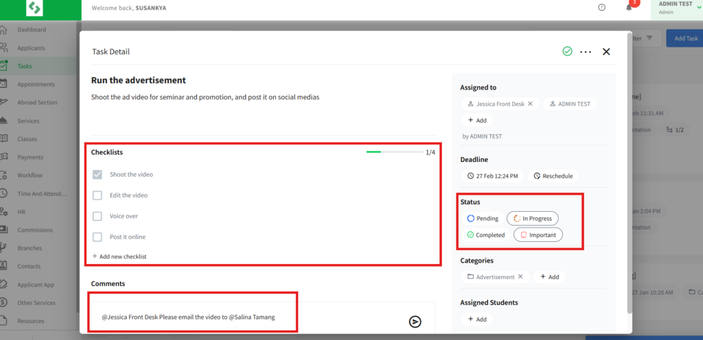 - Further, you are able to add the Description, create a Checklist (if required), and Comment (if any). You can also mention users in the comment section.