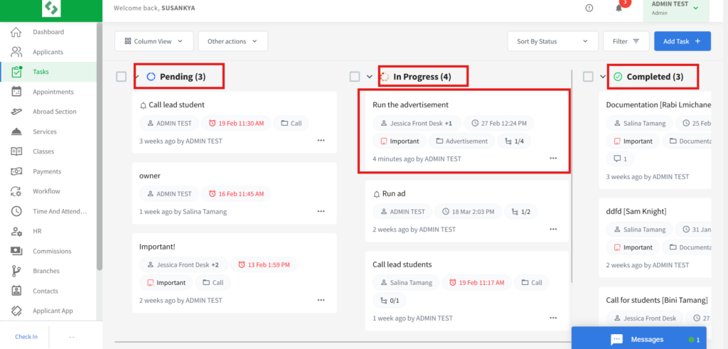 - Here, you can create the checklist for the tasks. The status bar shows your task status. If the task is yet to be started, then mark the status as pending. If the task in ongoing, then mark it In progress.