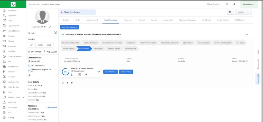 Once updated, the new visa status will be reflected in the student’s record, ensuring accurate and up-to-date tracking of visa processing activities.