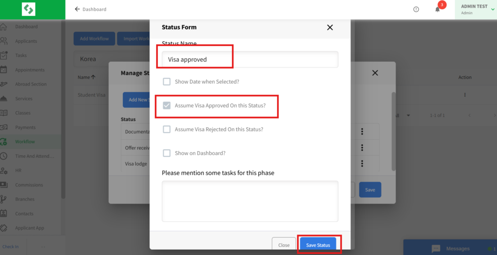 Important: When adding the workflow yourself, you need to add the status by clicking on the “Add New Status” button. You must select the Visa Approved checkbox to transfer the student’s status to Visa Decision. Likewise, for Visa Rejected, make sure to select the respective checkbox as well.